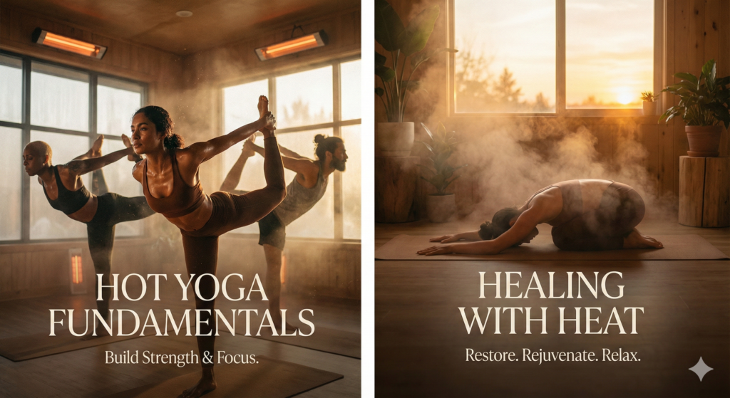 Hot Yoga = various yoga styles + 90–105°F + flexible format